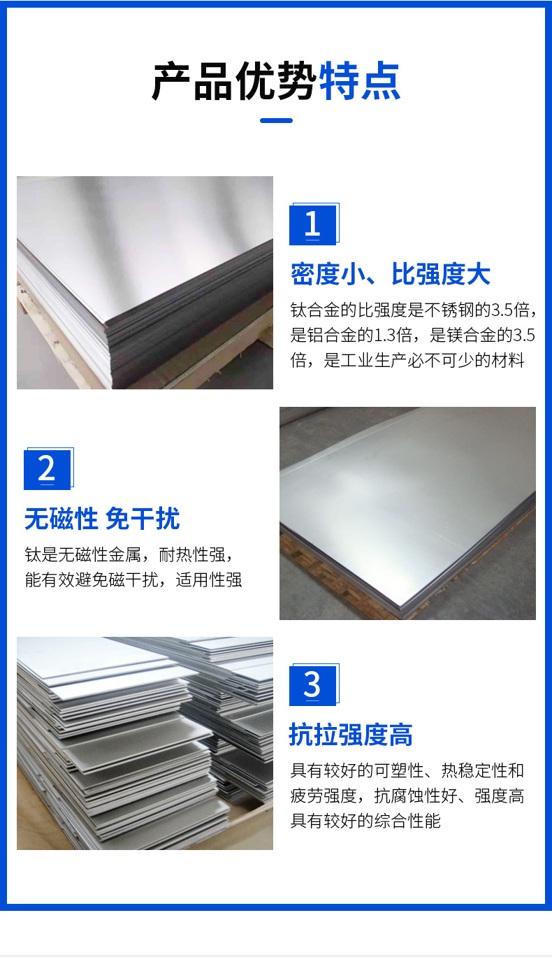 设计思路:东莞市安济金属制品有限公司是专注于钛合金板、钛棒、纯钛、钛块生产销售的实力厂家,针对用户群体的关注点,我们需要在页面上体现它是真正的实体工厂,让客户一看就能看出他的工厂实力及规模,因此在页面上以真实性、朴实为主,体现工厂实拍图即可,在文案上,体现出用户的目标行业及客户关注的规格厚度,体现我们的产品品质,能够提供材质证明以及各种检测证书等.
