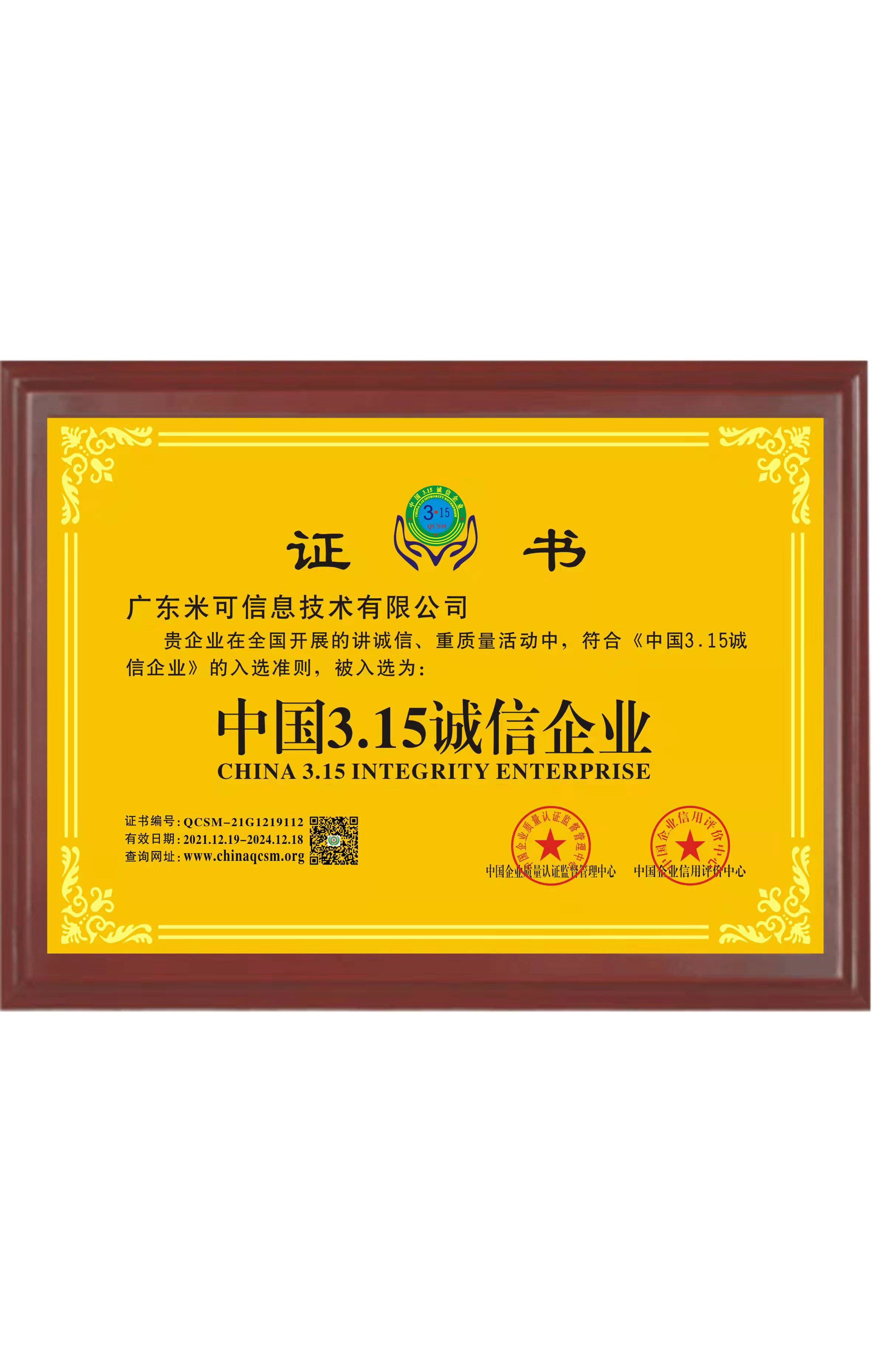 中国3.15诚信企业证书